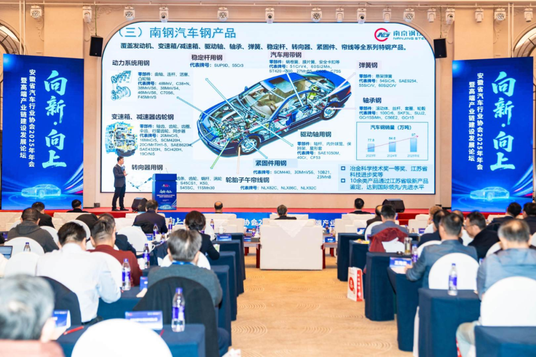 上海保隆汽车科技(安徽)有限公司、南京钢铁股份有限公司、安徽雄邦压铸有限公司等多家汽车在会上分别发布了最新科研成果、核心技术、亮点产品等。围绕中国超豪华智能电动汽车尊界S800的上市,安徽江淮汽车集团股份有限公司采购中心总经理秦战江特别做了一场题为《高端产业链建设的思考与实践》的主题报告。